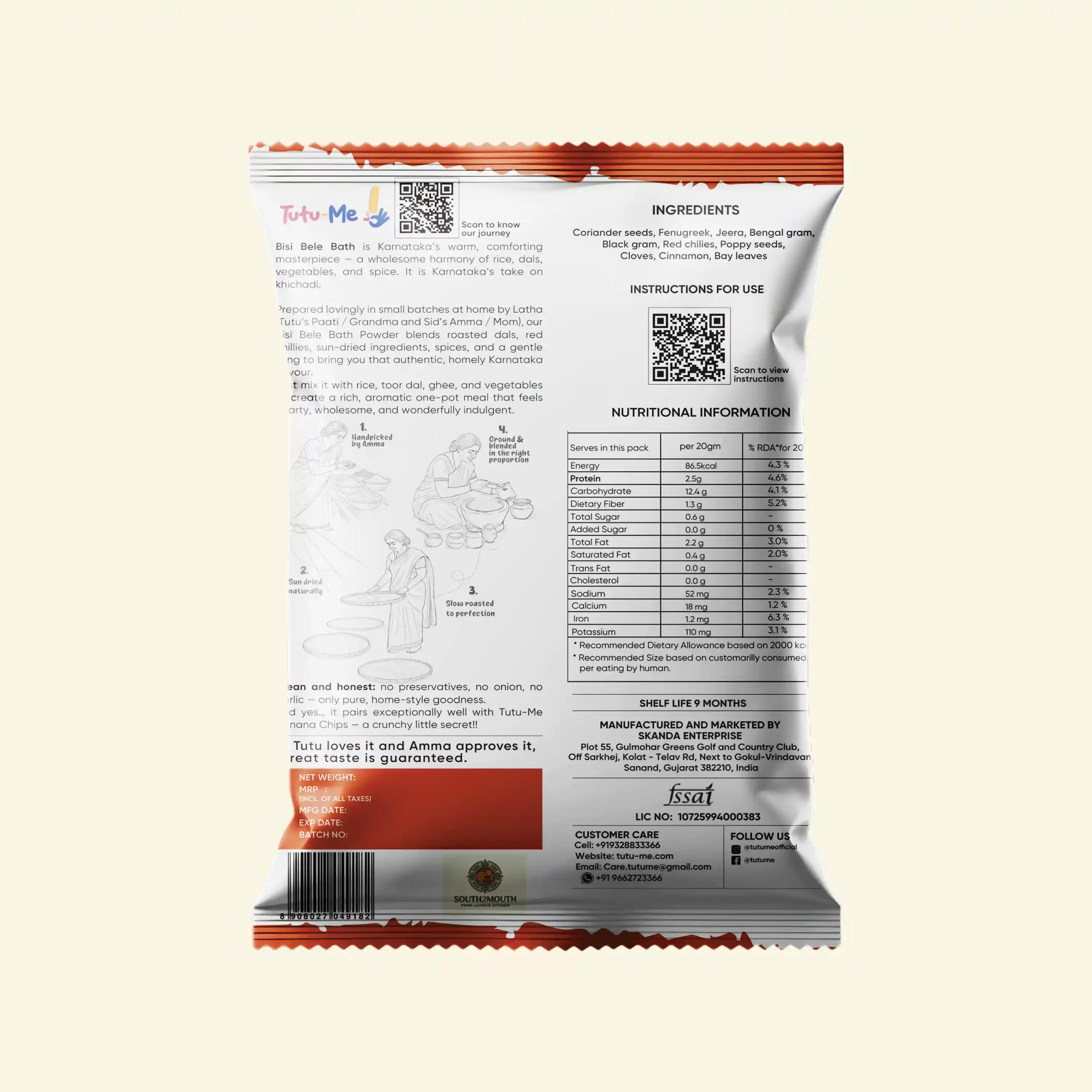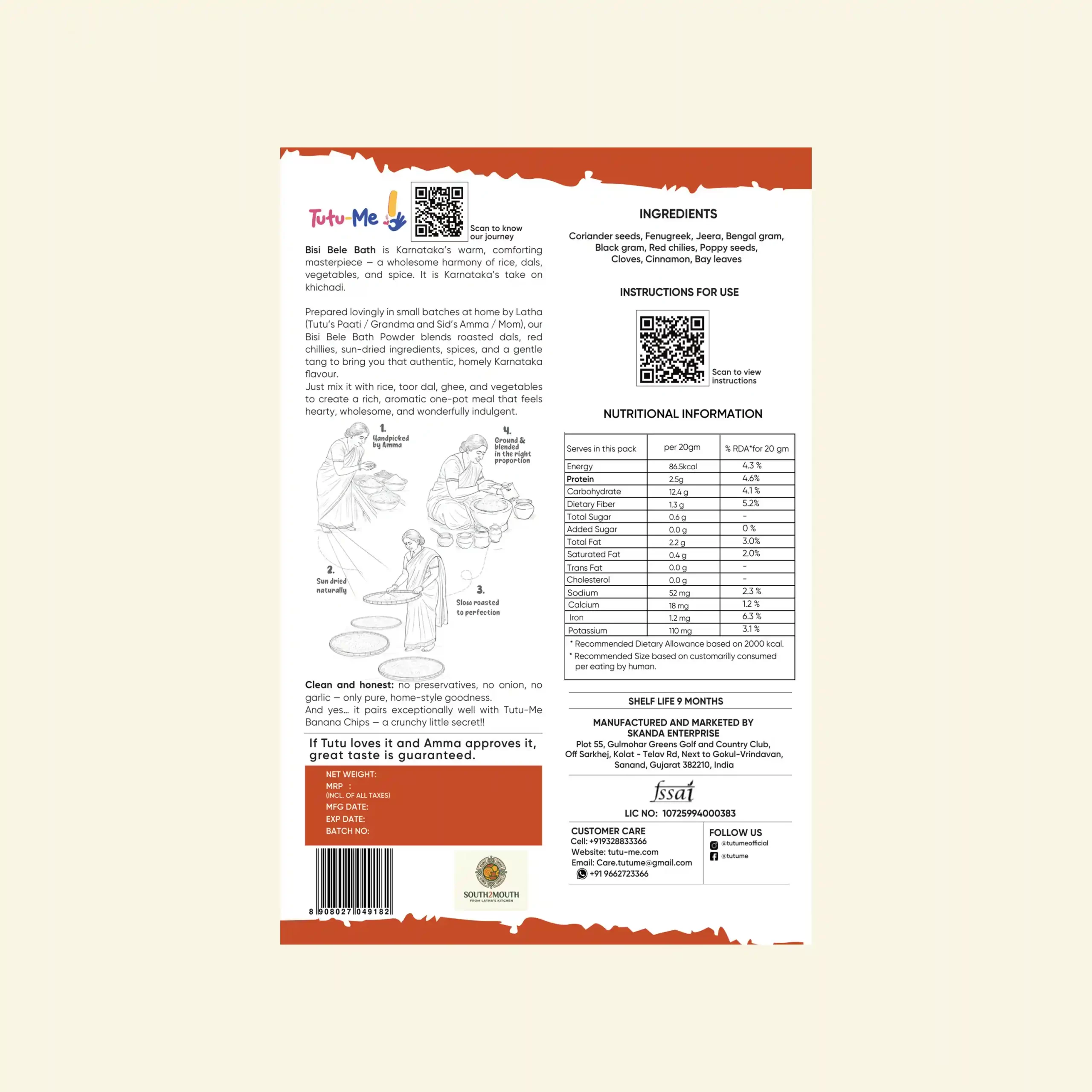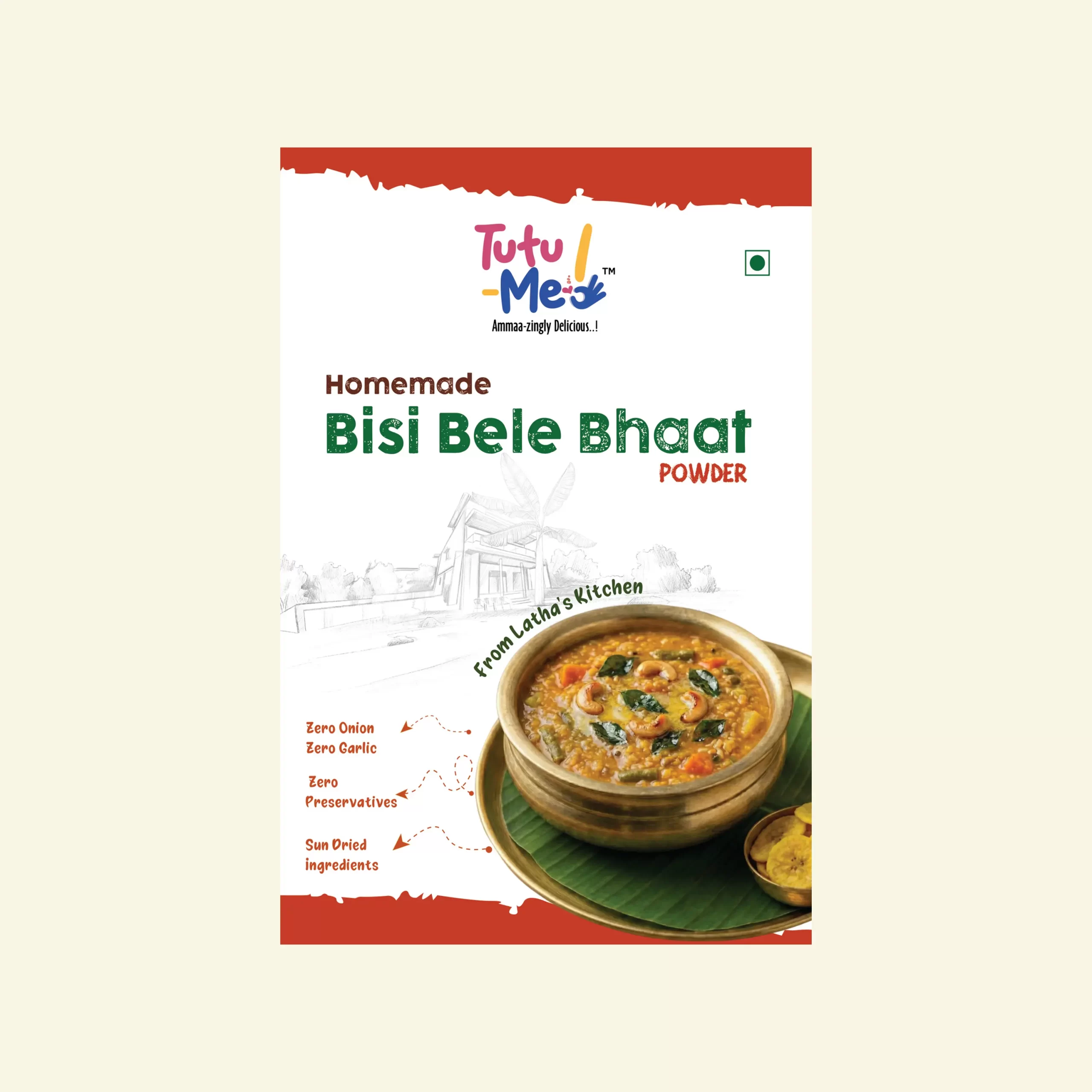 Prepared lovingly in small batches at home by Latha (Tutu’s Paati / Grandma and Sid’s Amma / Mom), our Bisi Bele Bath Powder blends roasted dals, red chillies, sun-dried ingredients, spices, and a gentle tang to bring you that authentic, homely Karnataka flavour.