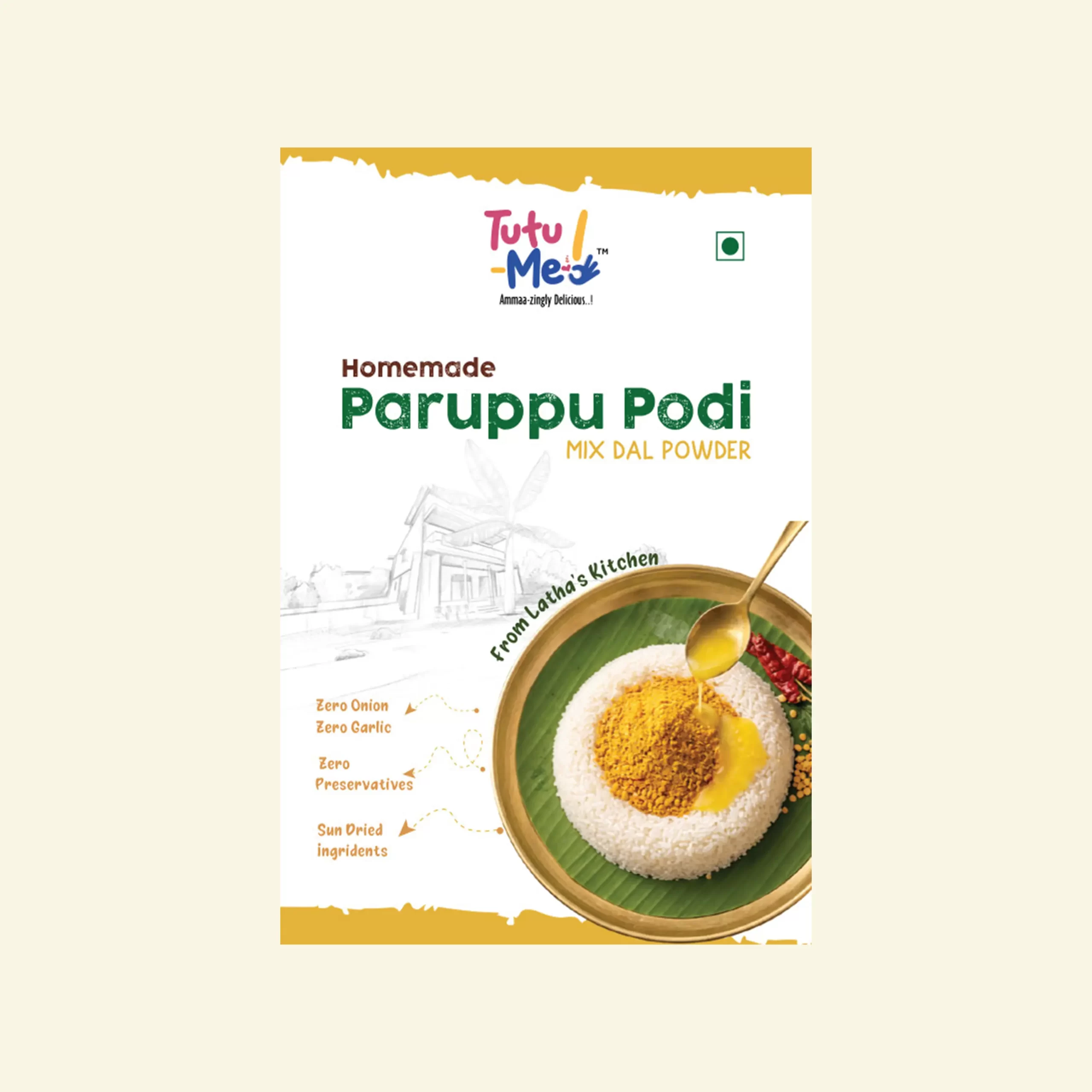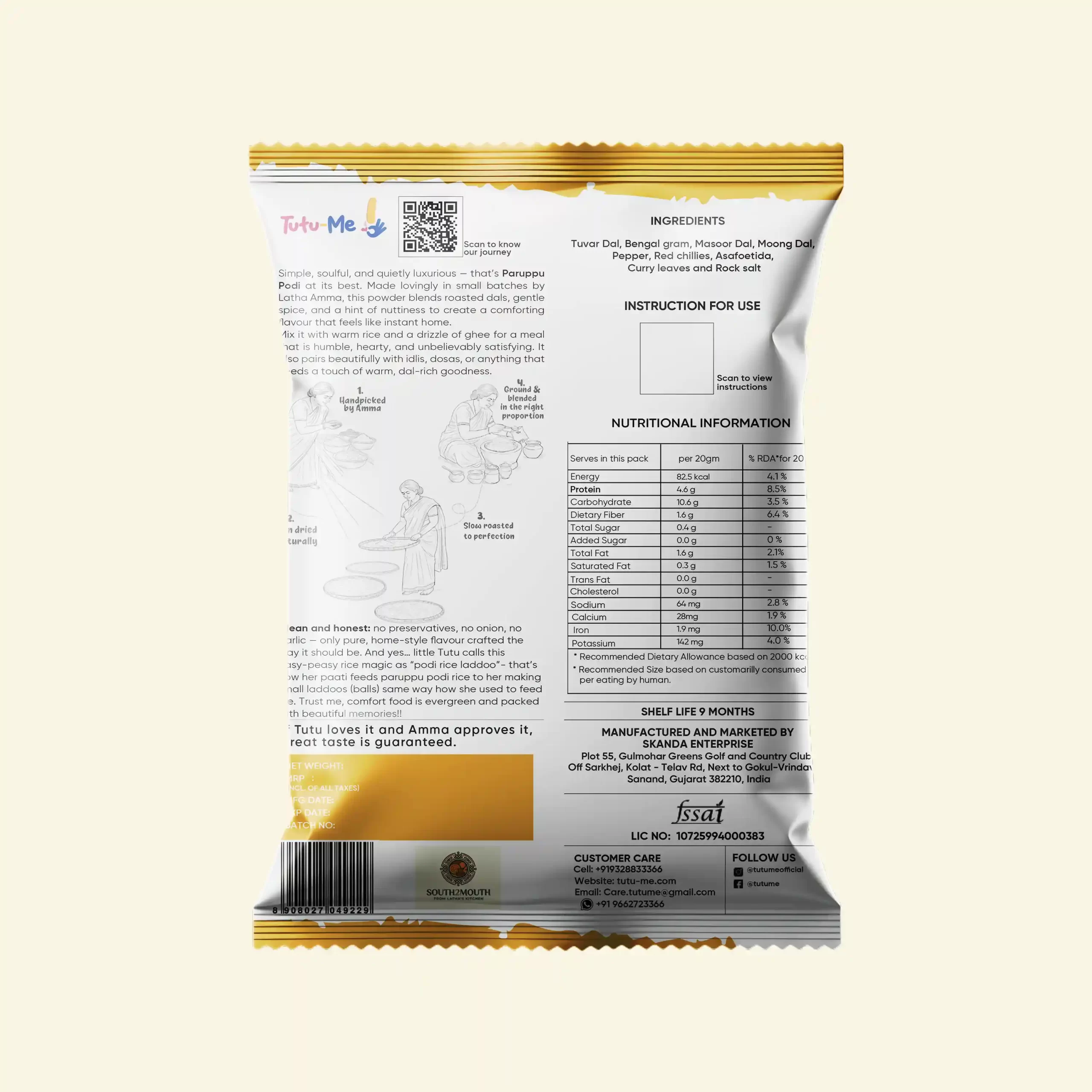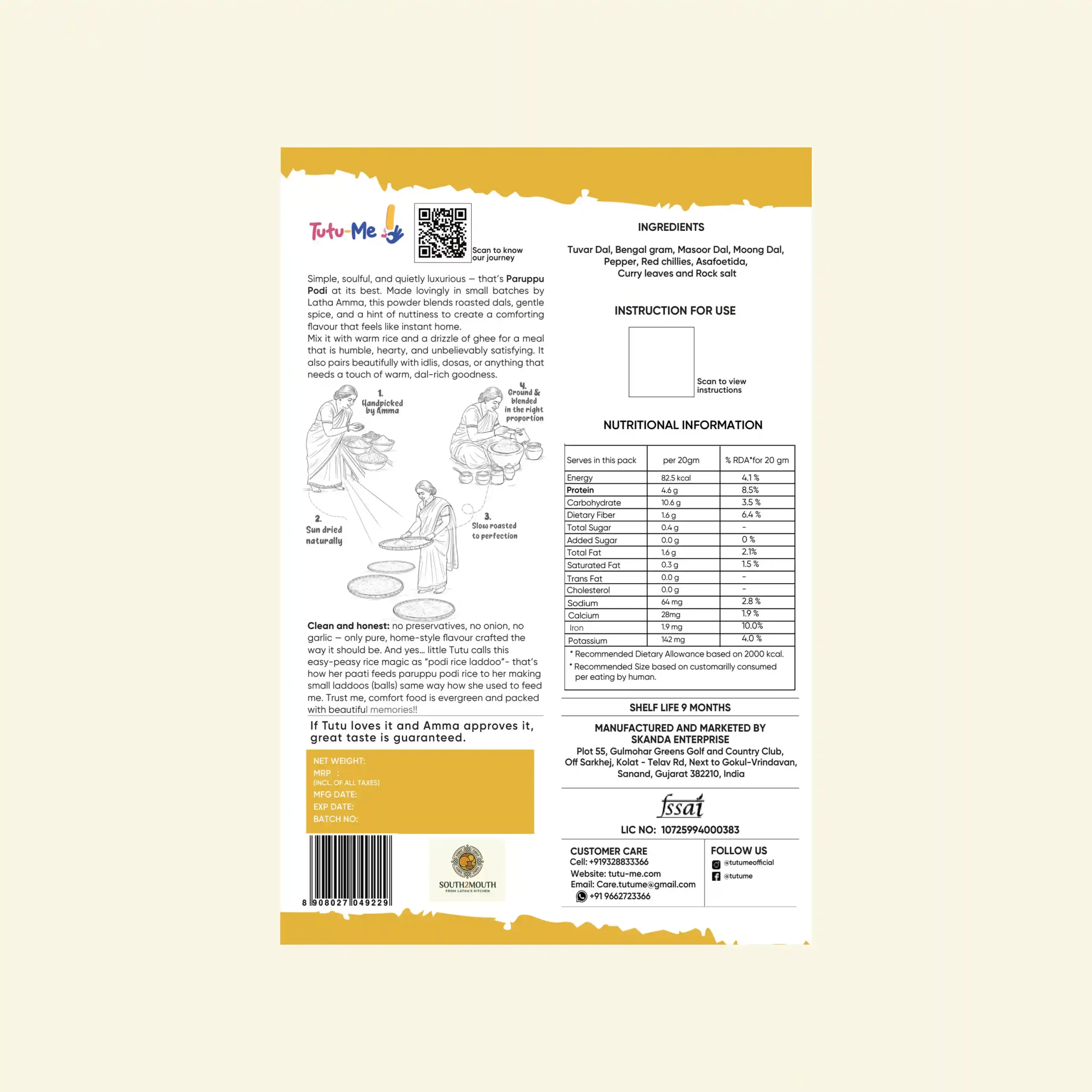 Made lovingly in small batches at home by Latha (Tutu’s Paati / Grandma and Sid’s Amma / Mom), this powder blends roasted dals, gentle spice, and a hint of nuttiness to create a comforting flavour that feels like instant home.