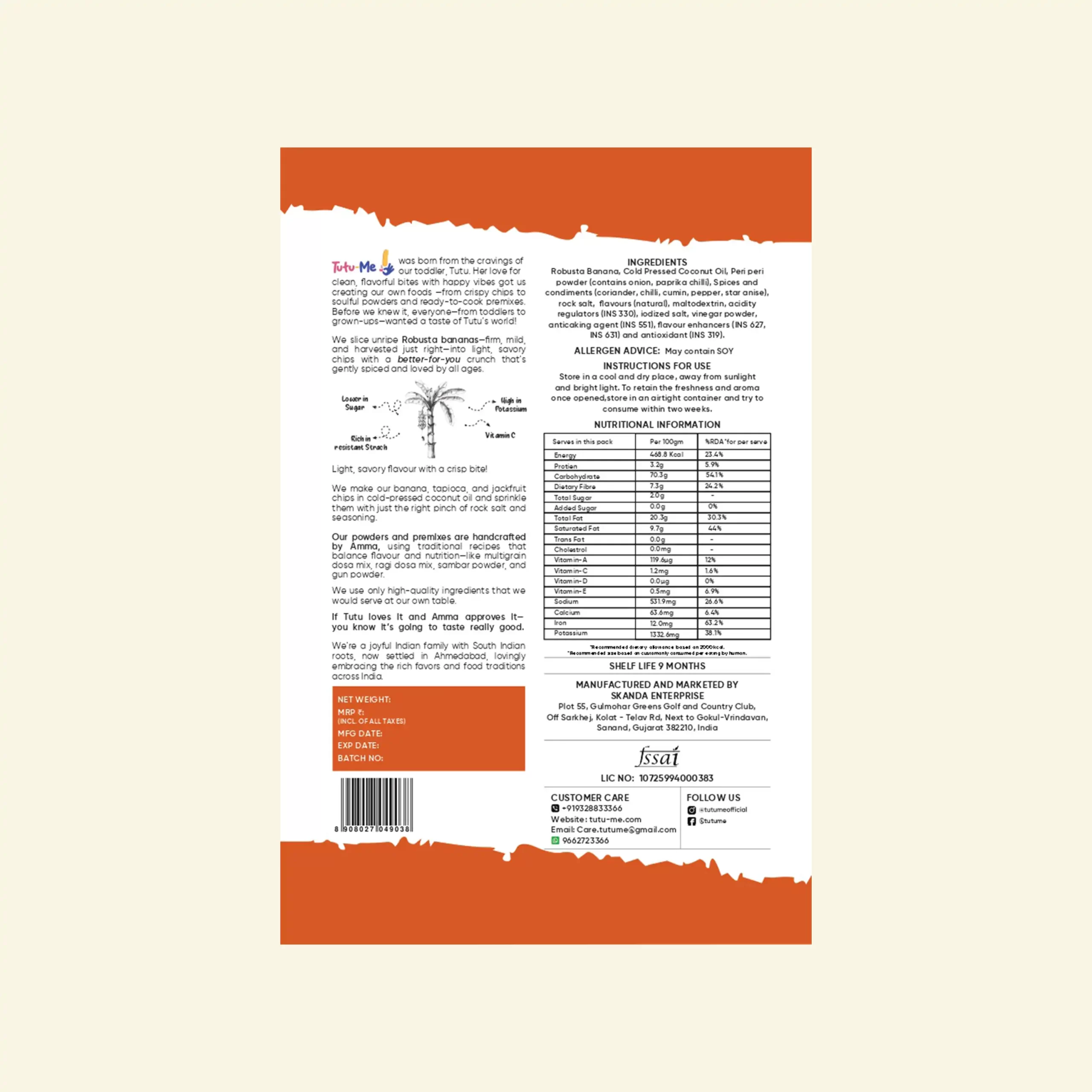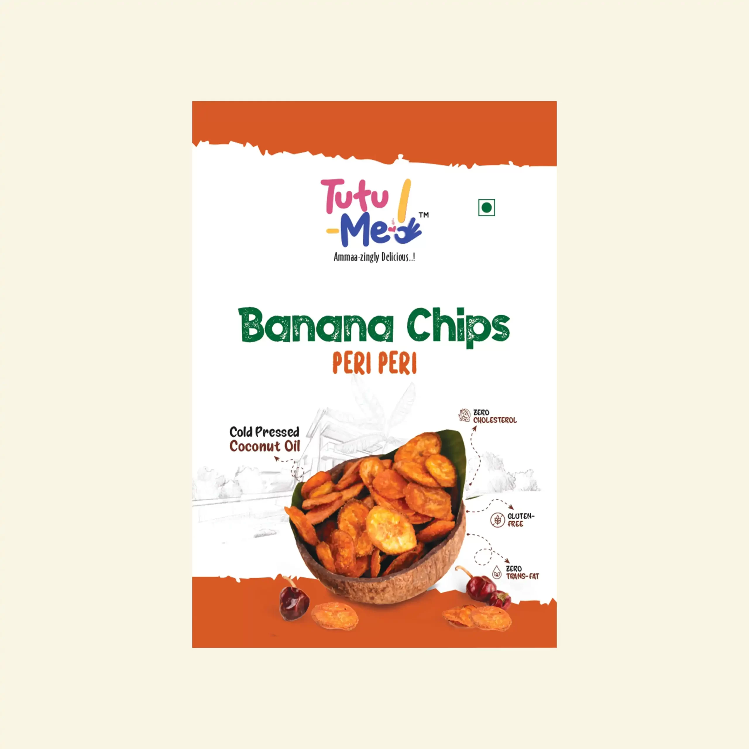 Our Peri Peri Banana Chips are made from Robusta bananas — sliced at the perfect unripe stage for a light, crunchy bite. Fried in cold-pressed coconut oil and coated with zesty peri peri seasoning, this snack is Kerala’s tradition with a global twist.