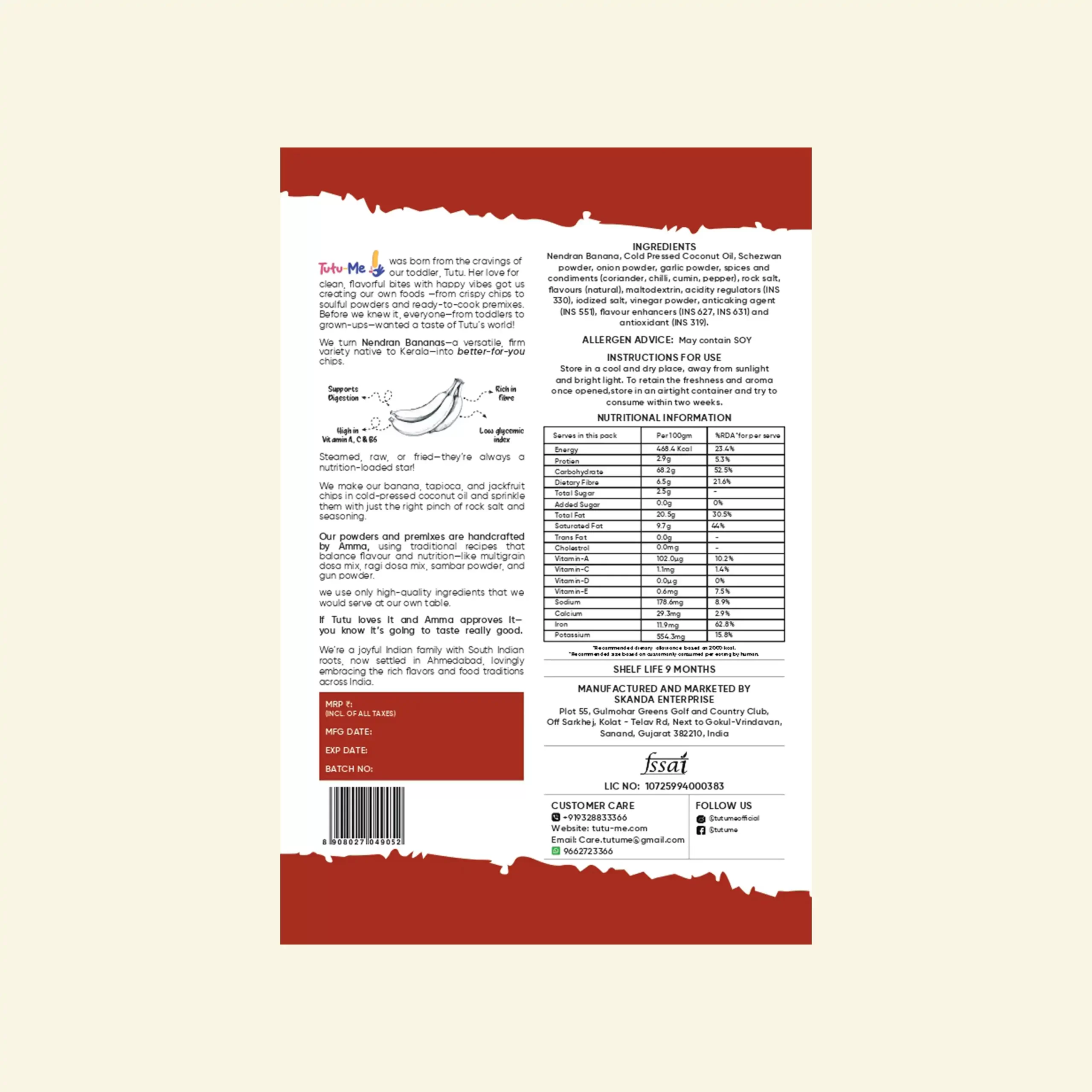 Tutu-Me chips are handmade in small batches using 100% cold-pressed coconut oil and traditional Kerala recipes. Our chips are vegan, gluten-free, zero trans-fat, zero cholesterol, preservative-free, and tested by NABL-accredited labs.